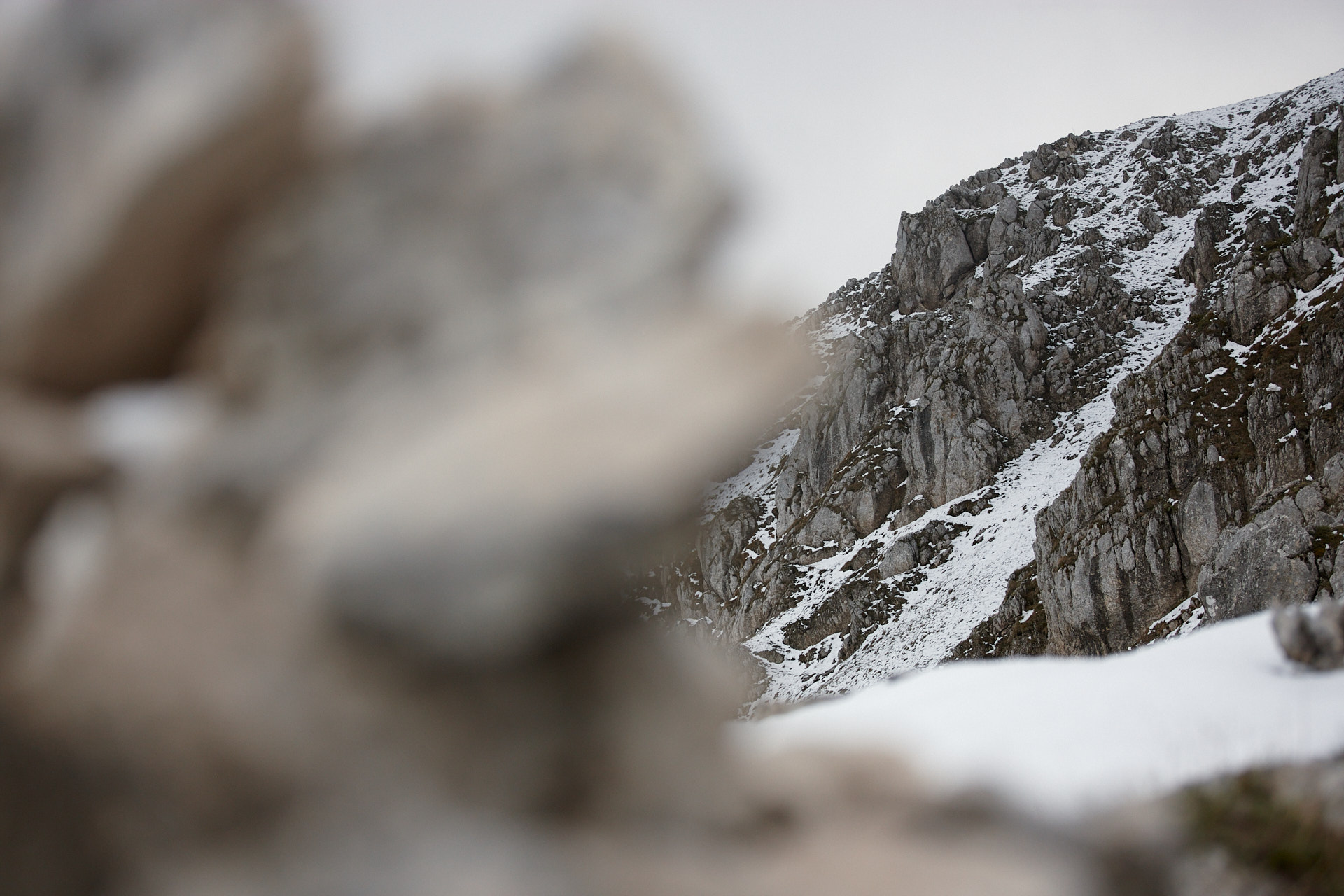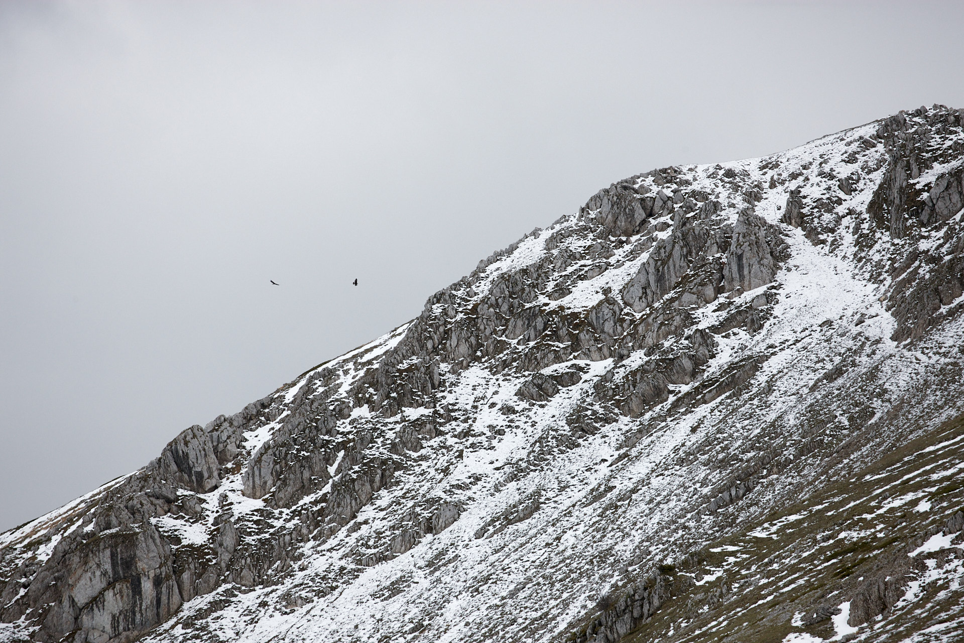 Una giornata invernale in piena Primavera lungo la cresta solitaria del Monte Orsello, la neve tardiva a chiazze sui rilievi, il volo delle aquile tra le guglie di rocce, cieli di ghiaccio e lame di luce al tramonto.